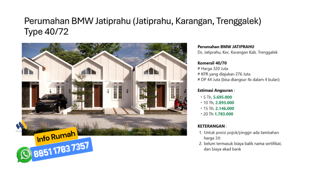 Dengan Perumahan BMW, Anda bisa memiliki rumah nyaman di kawasan strategis Kecamatan Trenggalek, Parakan, Trenggalek tanpa harus khawatir berlebihan soal biaya.