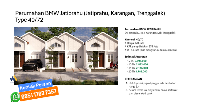 Dengan Perumahan BMW, Anda bisa memiliki rumah nyaman di kawasan strategis Kecamatan Watulimo, Margomulyo, Trenggalek tanpa harus khawatir berlebihan soal biaya.